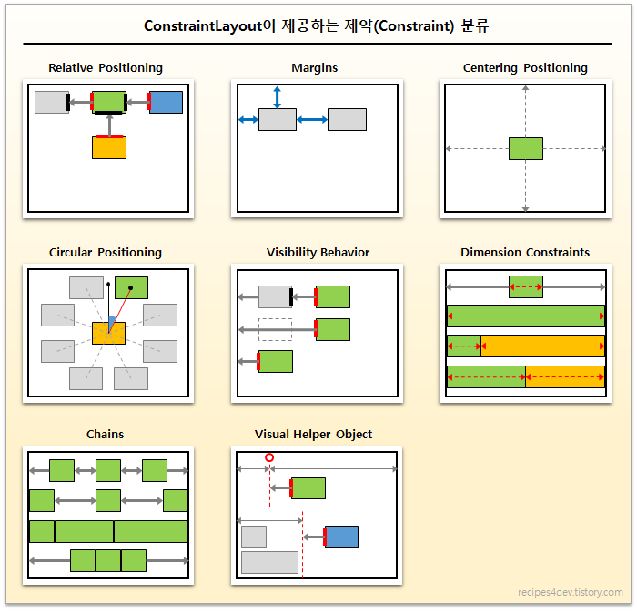 아래 그림은 컨스트레인트레이아웃에서 사용할 수 있는 제약(Constraint)들을 카테고리로 구분하여 정리한 내용인데요, 카테고리에 대한 분류와 기본적인 설명은 [안드로이드 개발 참조문서. ConstraintLayout]에서 참고할 수 있습니다.