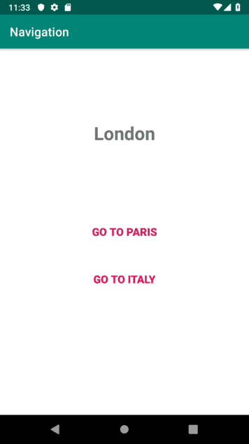 <navigation xmlns:android="http://schemas.android.com/apk/res/android" xmlns:app="http://schemas.android.com/apk/res-auto" xmlns:tools="http://schemas.android.com/tools" app:startDestination="@+id/london_screen"> <fragment android:id="@+id/london_screen" android:name="com.codechacha.navigation.LondonScreen" android:label="London screen" tools:layout="@layout/fragment_london_screen"> fragment> <fragment android:id="@+id/paris_screen" android:name="com.codechacha.navigation.ParisScreen" android:label="Paris screen" tools:layout="@layout/fragment_paris_screen"> fragment> <fragment android:id="@+id/italy_screen" android:name="com.codechacha.navigation.ItalyScreen" android:label="Italy screen" tools:layout="@layout/fragment_italy_screen"> fragment> navigation>