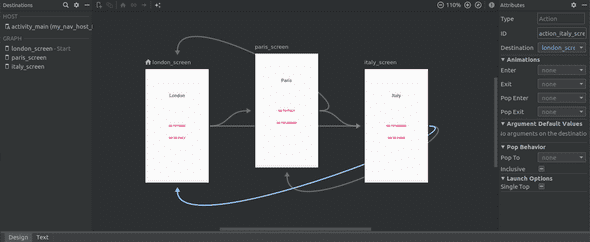 <navigation xmlns:android="http://schemas.android.com/apk/res/android" xmlns:app="http://schemas.android.com/apk/res-auto" xmlns:tools="http://schemas.android.com/tools" app:startDestination="@+id/london_screen"> <fragment android:id="@+id/london_screen" android:name="com.codechacha.navigation.LondonScreen" android:label="London screen" tools:layout="@layout/fragment_london_screen"> <action android:id="@+id/action_london_screen_to_paris_screen" app:destination="@id/paris_screen"/> <action android:id="@+id/action_london_screen_to_italy_screen" app:destination="@id/italy_screen"/> fragment> <fragment android:id="@+id/paris_screen" android:name="com.codechacha.navigation.ParisScreen" android:label="Paris screen" tools:layout="@layout/fragment_paris_screen"> <action android:id="@+id/action_paris_screen_to_italy_screen" app:destination="@id/italy_screen"/> <action android:id="@+id/action_paris_screen_to_london_screen" app:destination="@id/london_screen"/> fragment> <fragment android:id="@+id/italy_screen" android:name="com.codechacha.navigation.ItalyScreen" android:label="Italy screen" tools:layout="@layout/fragment_italy_screen"> <action android:id="@+id/action_italy_screen_to_paris_screen" app:destination="@id/paris_screen"/> <action android:id="@+id/action_italy_screen_to_london_screen" app:destination="@id/london_screen"/> fragment> navigation>