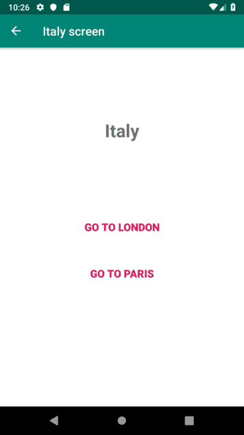 <androidx.constraintlayout.widget.ConstraintLayout xmlns:android="http://schemas.android.com/apk/res/android" xmlns:app="http://schemas.android.com/apk/res-auto" xmlns:tools="http://schemas.android.com/tools" android:layout_width="match_parent" android:layout_height="match_parent" tools:context=".LondonScreen"> <TextView android:layout_width="wrap_content" android:layout_height="wrap_content" android:text="London" android:textSize="30sp" android:textStyle="bold" app:layout_constraintTop_toTopOf="parent" app:layout_constraintEnd_toEndOf="parent" app:layout_constraintStart_toStartOf="parent" app:layout_constraintBottom_toTopOf="@+id/to_paris_from_london"/> <Button android:id="@+id/to_paris_from_london" style="@style/Widget.AppCompat.Button.Borderless" android:layout_width="wrap_content" android:layout_height="48dp" android:layout_marginStart="8dp" android:layout_marginEnd="8dp" android:text="Go to Paris" android:textColor="@color/colorAccent" android:textSize="18sp" android:textStyle="bold" app:layout_constraintTop_toTopOf="parent" app:layout_constraintBottom_toBottomOf="parent" app:layout_constraintEnd_toEndOf="parent" app:layout_constraintStart_toStartOf="parent"/> <Button android:id="@+id/to_italy_from_london" style="@style/Widget.AppCompat.Button.Borderless" android:layout_width="wrap_content" android:layout_height="48dp" android:layout_marginStart="8dp" android:layout_marginEnd="8dp" android:text="Go to Italy" android:textColor="@color/colorAccent" android:textSize="18sp" android:textStyle="bold" android:layout_marginTop="30dp" app:layout_constraintTop_toBottomOf="@+id/to_paris_from_london" app:layout_constraintEnd_toEndOf="parent" app:layout_constraintStart_toStartOf="parent"/> androidx.constraintlayout.widget.ConstraintLayout>