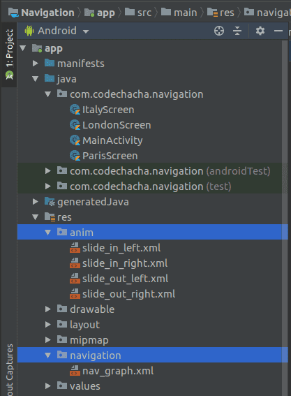 <navigation xmlns:android="http://schemas.android.com/apk/res/android" xmlns:app="http://schemas.android.com/apk/res-auto" xmlns:tools="http://schemas.android.com/tools" app:startDestination="@+id/london_screen"> <fragment android:id="@+id/london_screen" android:name="com.codechacha.navigation.LondonScreen" android:label="London screen" tools:layout="@layout/fragment_london_screen"> fragment> <fragment android:id="@+id/paris_screen" android:name="com.codechacha.navigation.ParisScreen" android:label="Paris screen" tools:layout="@layout/fragment_paris_screen"> fragment> <fragment android:id="@+id/italy_screen" android:name="com.codechacha.navigation.ItalyScreen" android:label="Italy screen" tools:layout="@layout/fragment_italy_screen"> fragment> <action android:id="@+id/action_global_london_screen" app:destination="@id/london_screen" app:popEnterAnim="@anim/slide_in_left" app:popExitAnim="@anim/slide_out_right" app:enterAnim="@anim/slide_in_right" app:exitAnim="@anim/slide_out_left"/> <action android:id="@+id/action_global_paris_screen" app:destination="@id/paris_screen" app:popEnterAnim="@anim/slide_in_left" app:popExitAnim="@anim/slide_out_right" app:enterAnim="@anim/slide_in_right" app:exitAnim="@anim/slide_out_left"/> <action android:id="@+id/action_global_italy_screen" app:destination="@id/italy_screen" app:popEnterAnim="@anim/slide_in_left" app:popExitAnim="@anim/slide_out_right" app:enterAnim="@anim/slide_in_right" app:exitAnim="@anim/slide_out_left"/> navigation>