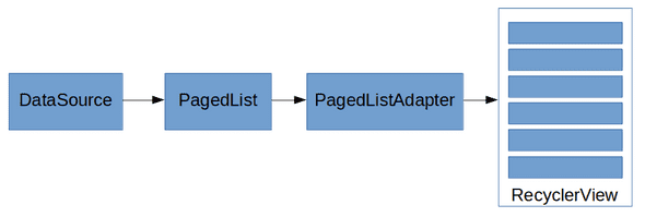 PagedList는 DataSource를 이용하여 Local또는 Backend로부터 데이터를 가져옵니다. 그 데이터는 PagedListAdapter로 전달되어 RecyclerView에 출력됩니다.