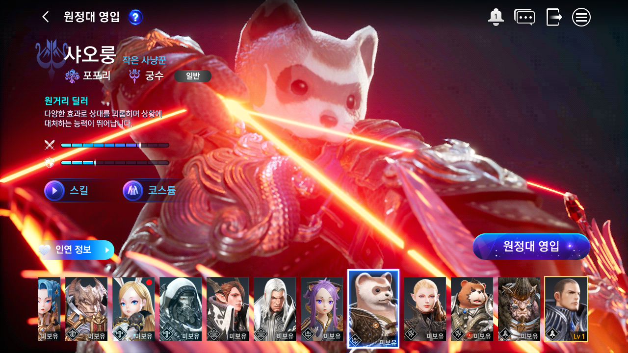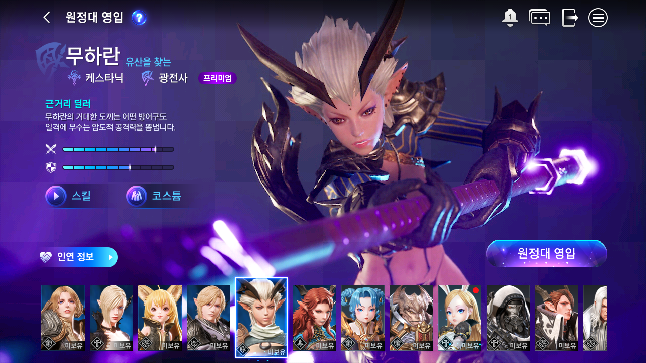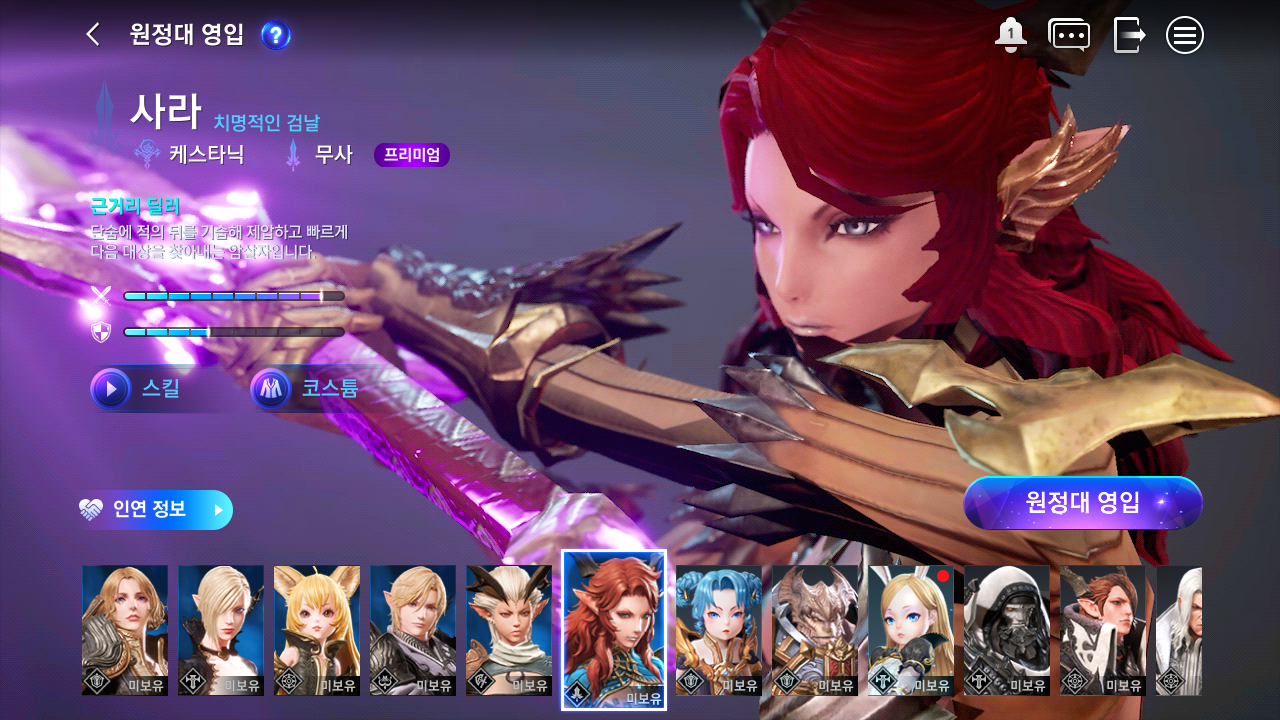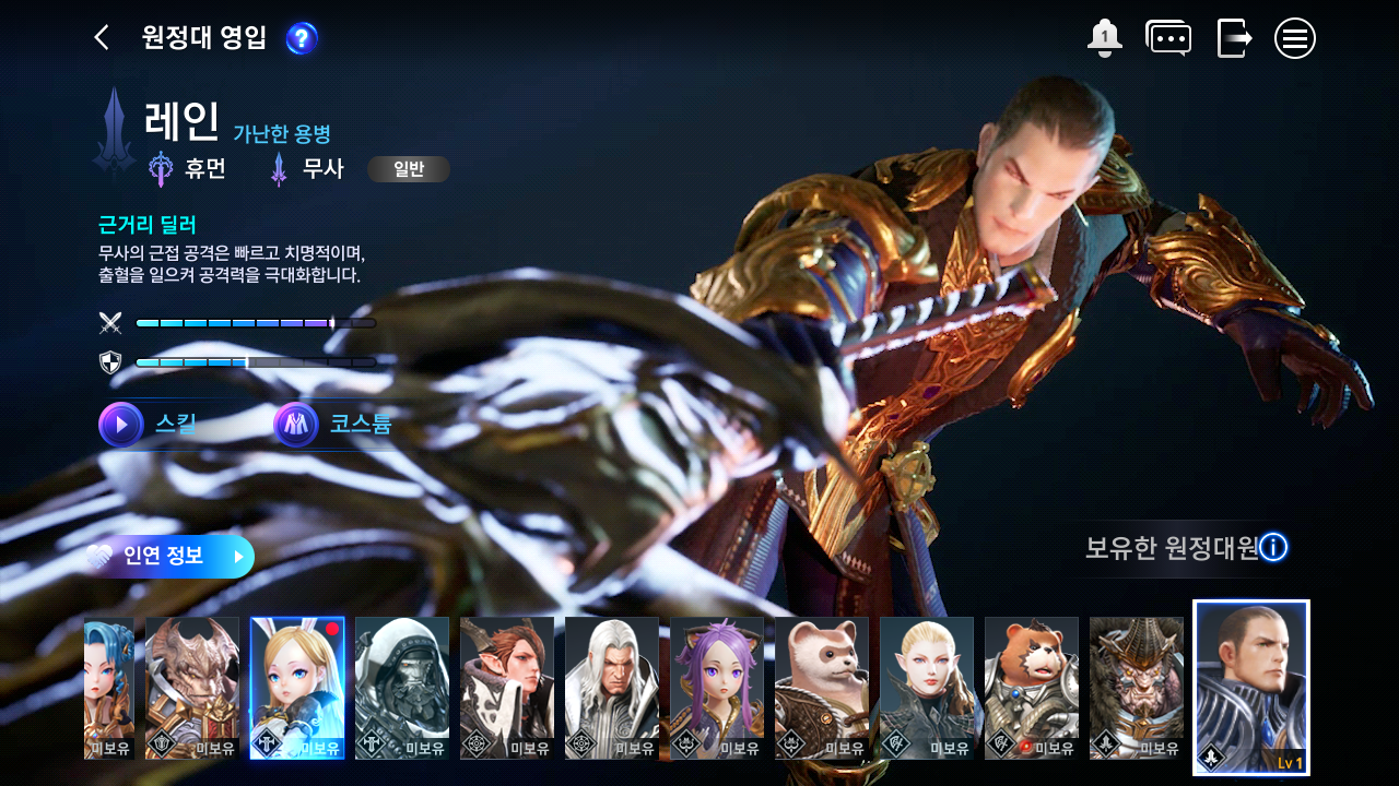 처음 시작하면 무사 캐릭터가 나온다. 다른 게임처럼 처음 시작 시 원하는 캐릭터를 선택하는 방식이 아니다. 원정대라는 게 있어서 캐릭터를 영입하는 시스템이다.