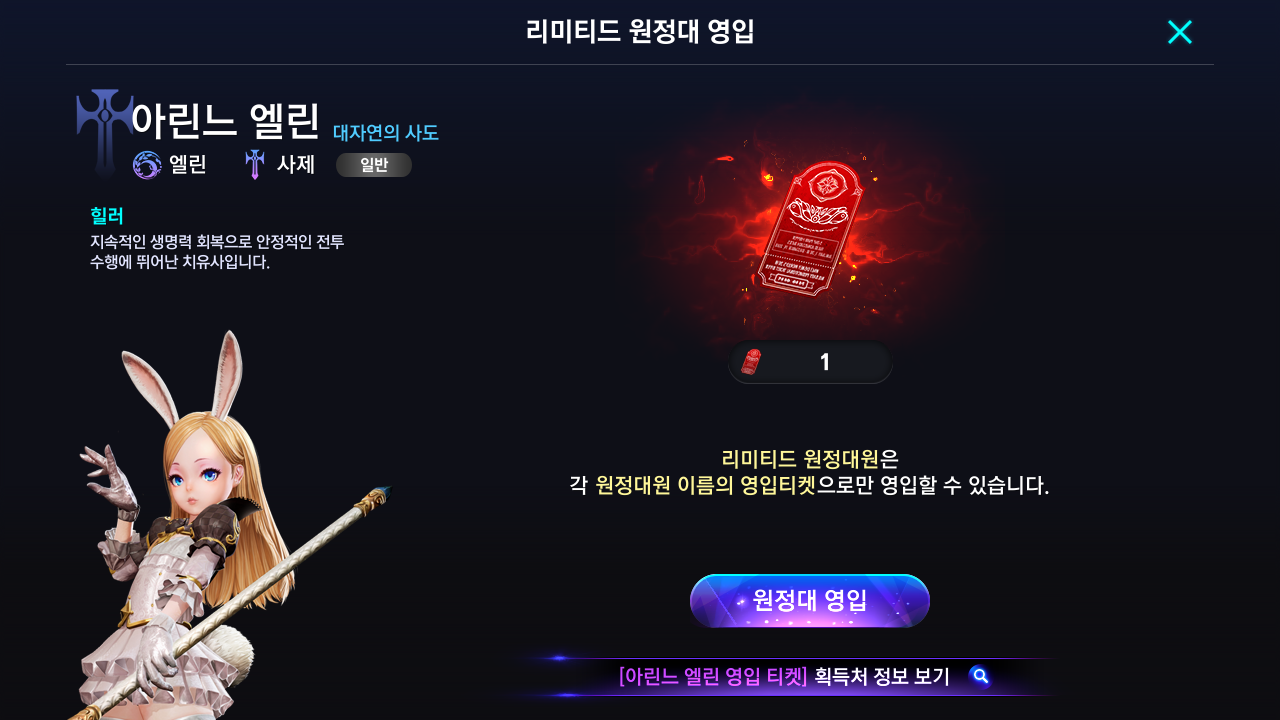 영입할 수 있는 캐릭터는 18명이 있다. 처음 주는 티켓은 아린느 엘린만 영입할 수 있는 리미티드 티켓이다.