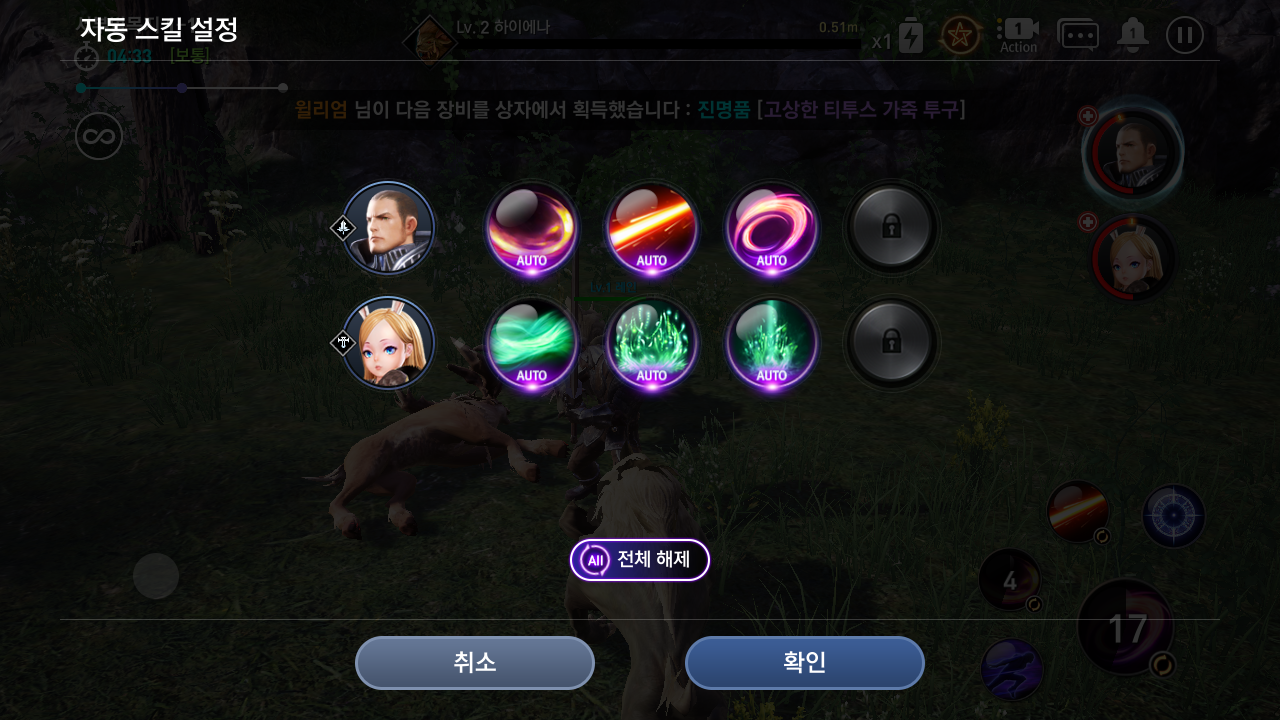 상단의 별모양의 빛나는 아이콘을 선택하면 자동스킬 설정을 할 수 있다. 자동으로 사용할 스킬을 자동으로 설정할 수 있다.