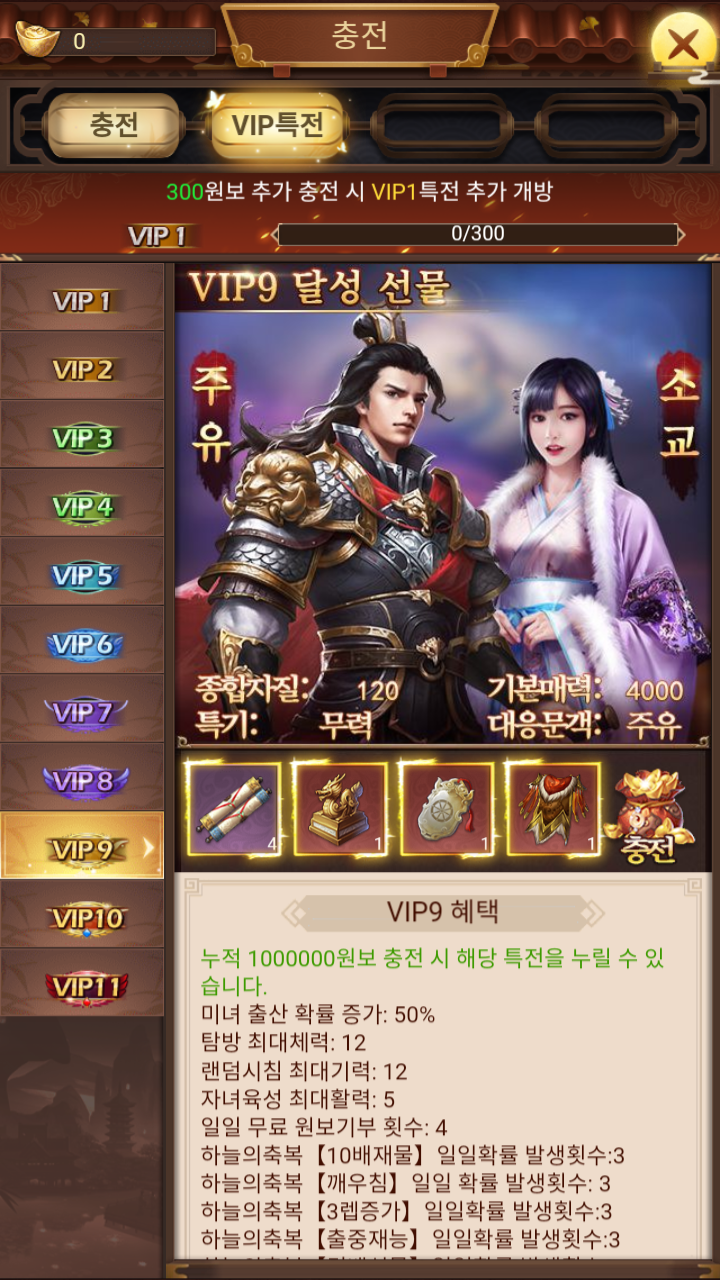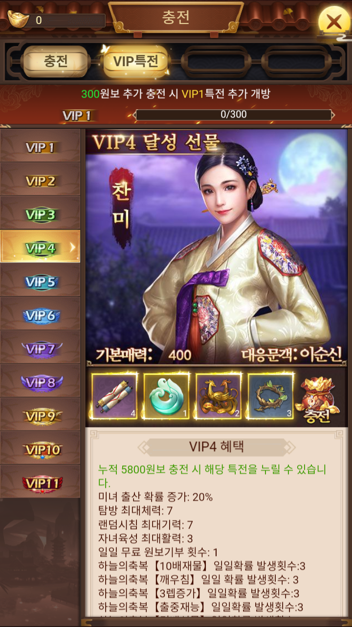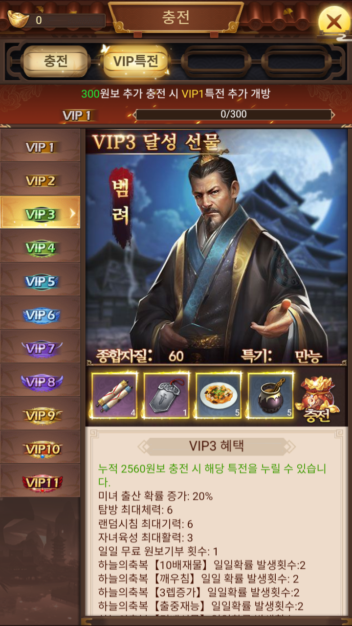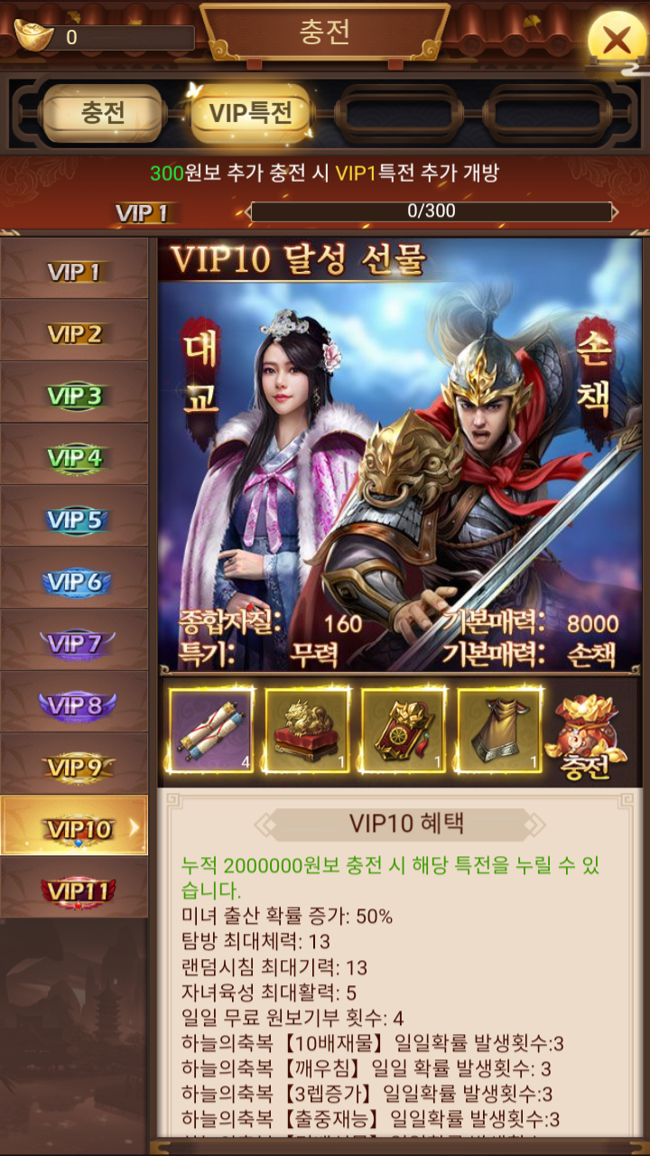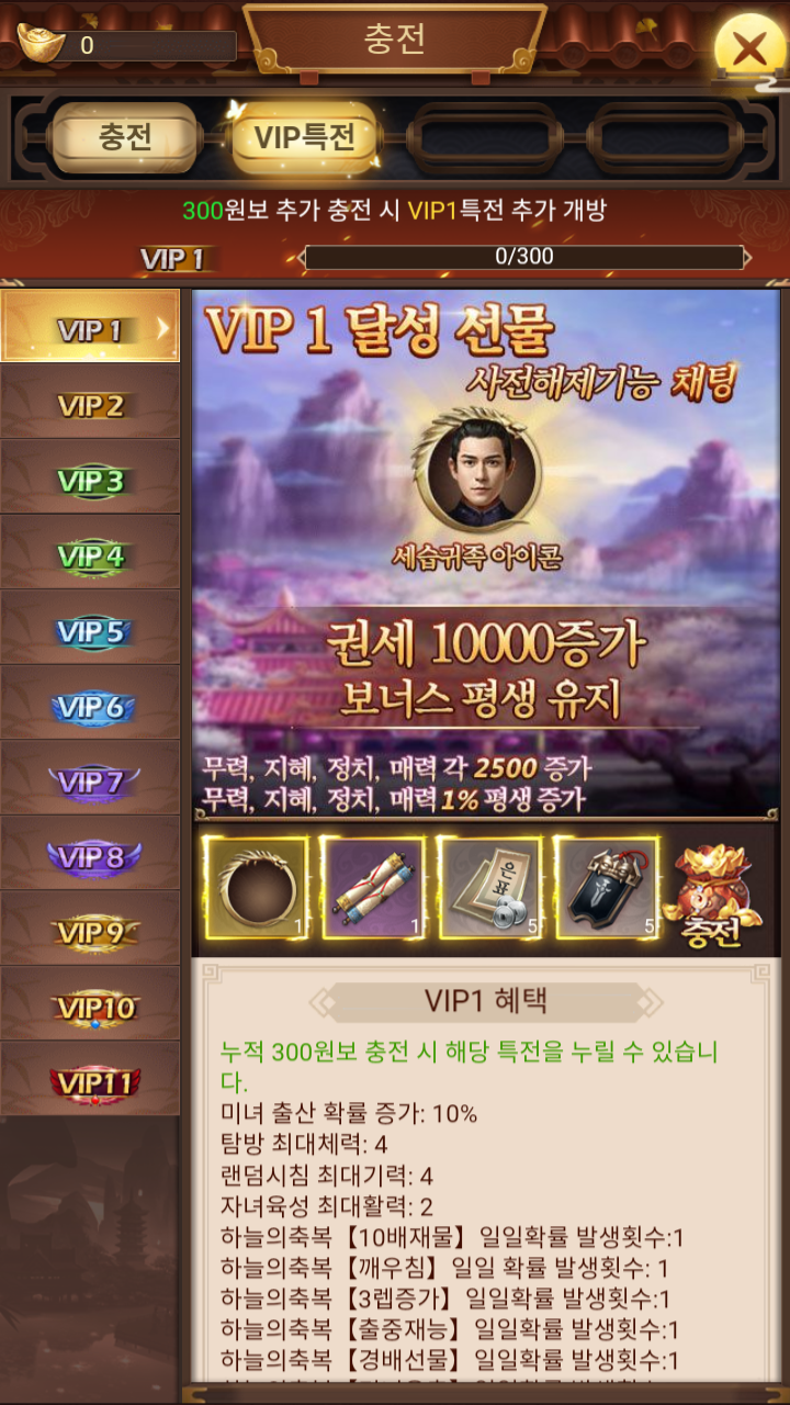 다른 중국게임들 처럼 VIP 등급에 따라서 혜택이 있다. VIP등급은 1부터 11까지 있다.