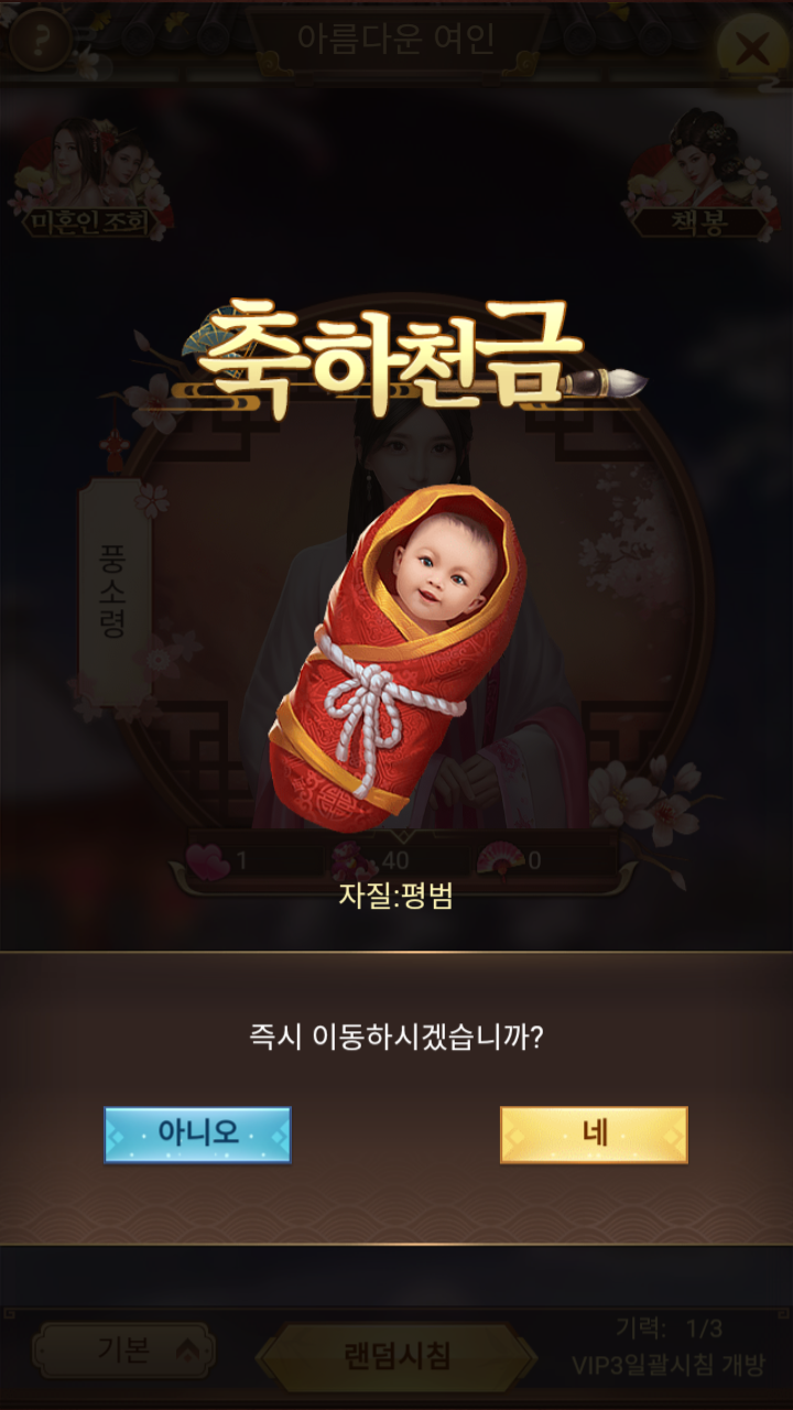 랜덤시침을 할 경우 아래와 같이 멘트가 나오면서 잠자리?를 하게 되는거 같다. 몇번 랜덤시침을 하면 자녀가 태어난다.