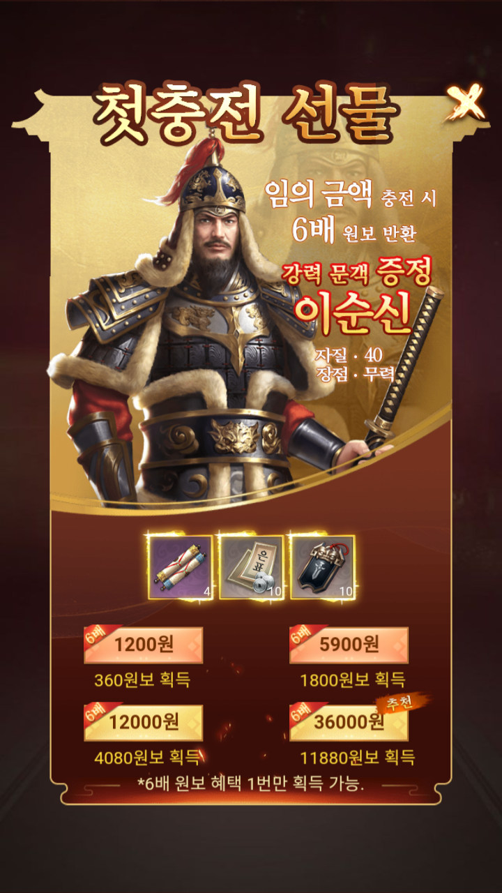 첫충전 시에는 이순신 장군을 선물로 준다. 뜬금없네..