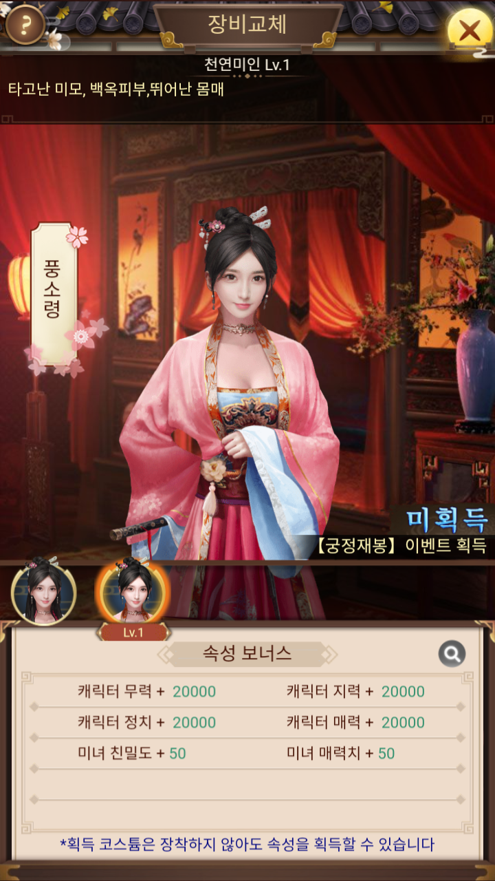중앙에 있는 미녀를 선택하면 몇가지 선택할 수 있는 메뉴가 생긴다. 미녀에게 총애/하사를 통해서 총애 및 매력을 올릴 수 있다.