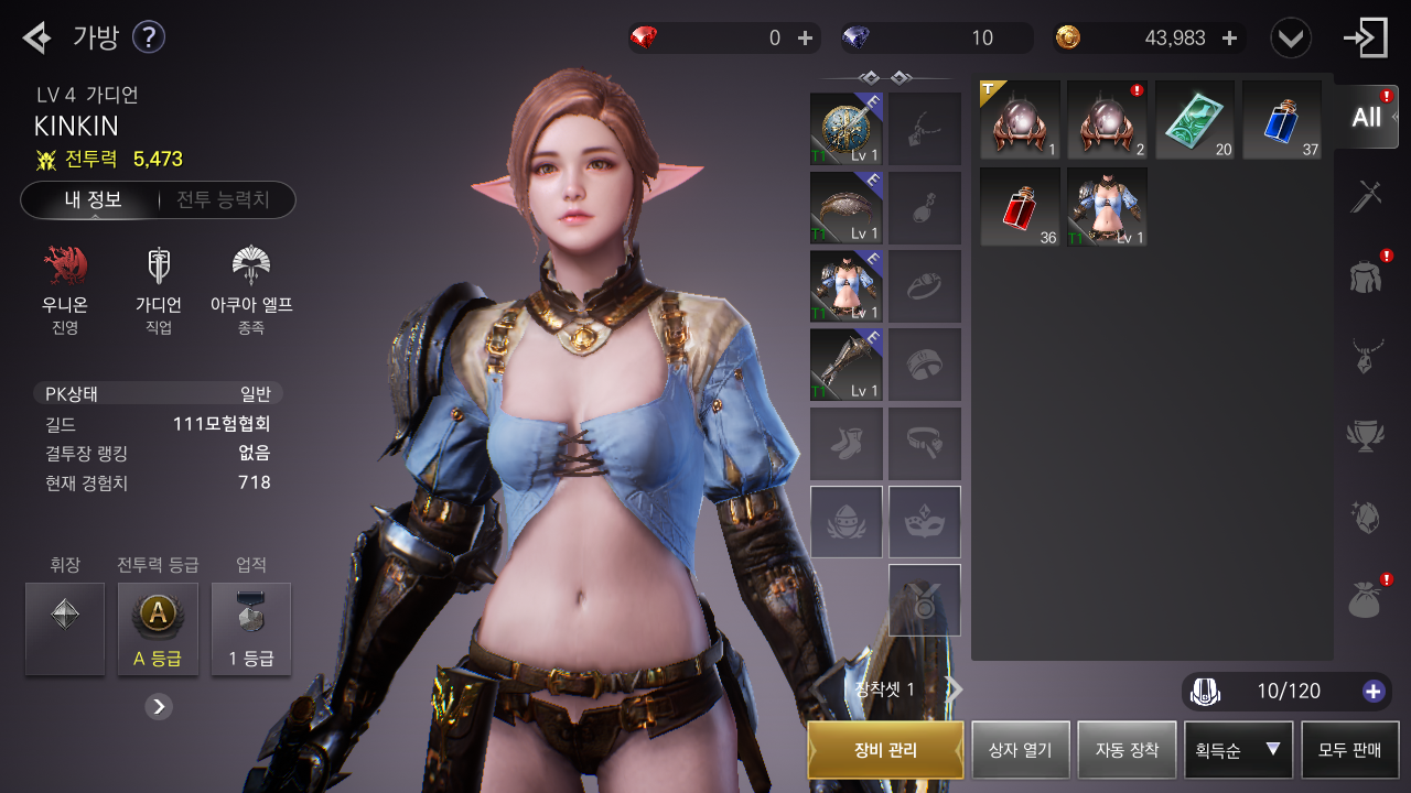 가방화면에서는 가지고 있는 아이템 목록과 해당 아이템을 착용할 수 있다.