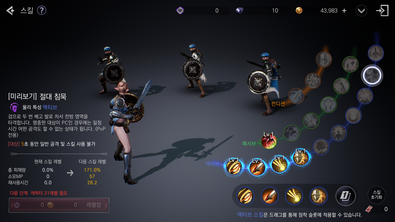 스킬창에서는 스킬 종류별로 3가지로 나열되어 있고, 해당 레벨이 되면 스킬을 배울 수 있다.